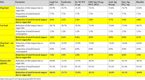 세계 모든 개가 채식으로 전환하면 개 사료 생산을 위해 사용되는 토지 면적이 사우디아라비아 영토보다 더 많이 감소하고, 고양이가 채식으로 전환하면 독일보다 넓은 면적이 줄어드는 것으로 나타났다. 모든 인간이 채식으로 전환할 때 줄어드는 축산용 토지 면적은 러시아와 인도를 합친 것보다 넓을 것으로 예상됐다.