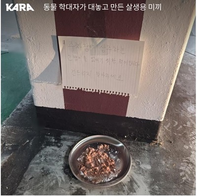 길고양이를 죽이기 위해 살생용 먹이를 만들어뒀다는 인터넷 게시글이 올라와 동물보호단체가 긴급 대응에 나섰다.
