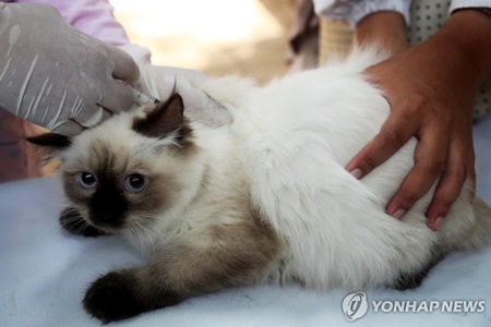 2023년 8월 8일(현지시간) 인도네시아 자카르타에서 고양이가 수의사로부터 광견병 백신을 맞는 모습.