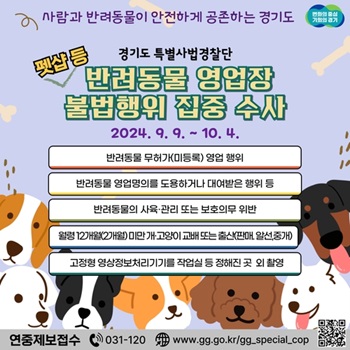경기도 특별사법경찰단이 9월 9일부터 10월 4일까지 동물판매업소(일명 '펫샵') 등 반려동물 영업장의 불법행위를 집중수사한다.