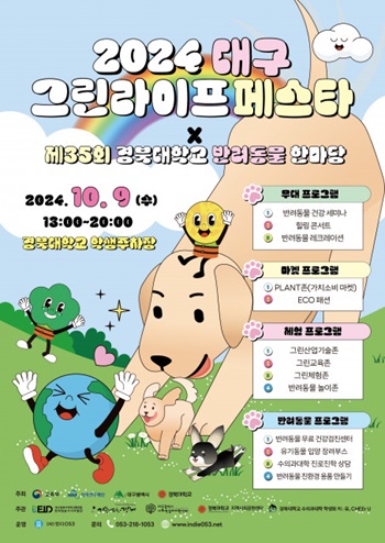 경북대 전자정보기기사업단은 커뮤니티와경제, 경북대학교 수의과대학학생회 치:유(CHEEr U)와 함께 10월 9일 오후 1시 경북대학교 학생주차장에서 ‘2024 대구그린라이프페스타X제35회 경북대학교 반려동물 한마당’(이하 대구그린라이프페스타X반려동물한마당)을 개최한다.