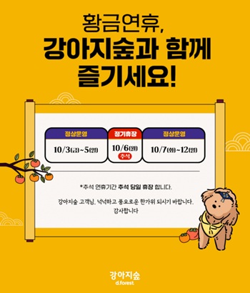 강아지숲은 한가위를 맞아 강아지숲에서 반려견과 가을 정취를 느낄 수 있도록 온라인 프로모션을 마련했다며, 앞으로도 반려가족의 행복과 올바른 반려 문화 조성에 앞장서겠다고 밝혔다.