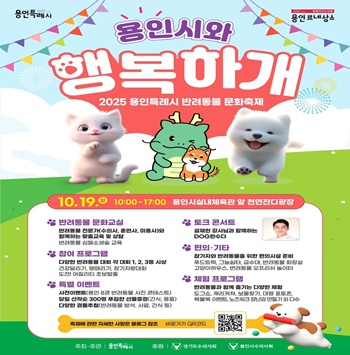 경기 용인시는 오는 19일 오전 10시부터 오후 5시까지 용인실내체육관 앞 잔디광장에서 반려동물 문화축제인 '용인시와 행복하개'를 개최한다고 5일 밝혔다.