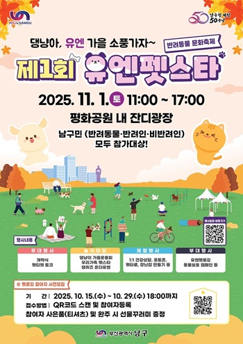 부산광역시 남구는 오는 11월 1일(토), 구 개청 50주년을 기념해 평화공원 내 잔디광장에서 '제1회 유엔펫스타(Pet Star, 반려동물 문화축제'를 개최한다고 밝혔다.
