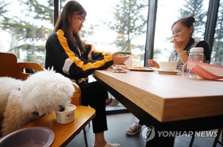 시장 규모는 6조 원을 넘어선 뒤 향후에도 연간 10%대 성장을 이어갈 것으로 전망된다.사진은 28일 오후 경기 남양주 현대프리미엄아울렛 스페이스원에 입점한 하이엔드 펫 토탈샵 코코스퀘어에서 반려견과 주인이 함께 식사하는 모습. 2021.9.28 scape@yna.co.kr